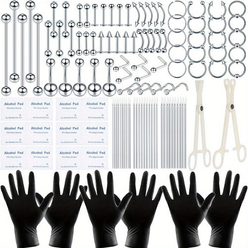 120PCS Body Piercing Kit Surgical Steel 14G 16G 20G BCR CBR Labret Lip Rings Cartilage Daith Earrings Nose Septum Nose Studs Belly Button Rings Jewelry Needles Gloves Clamps Tools